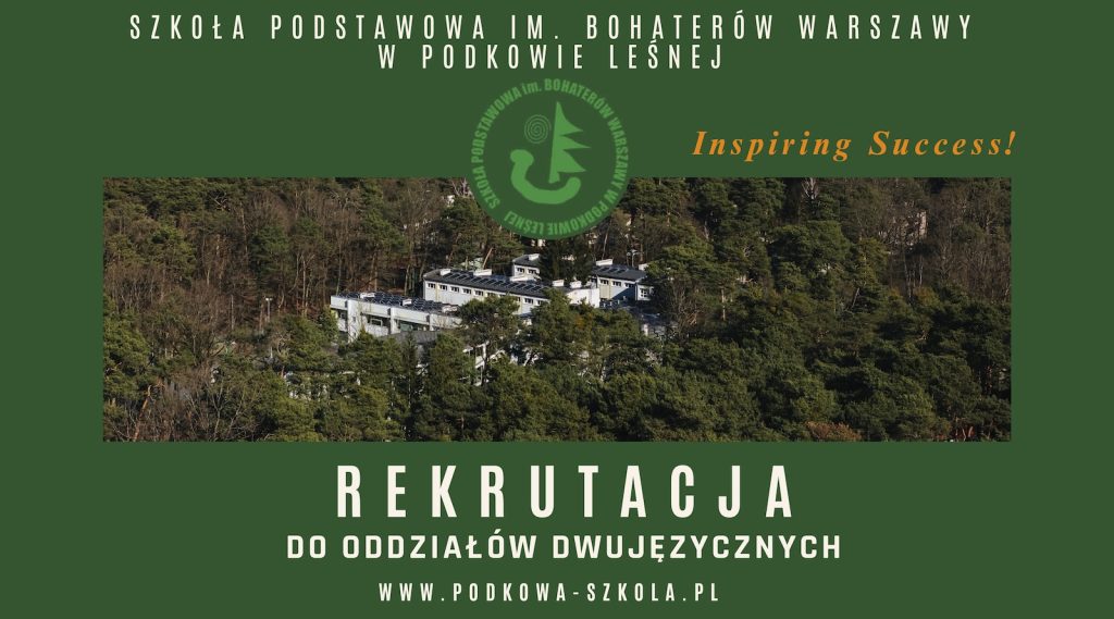 Witamy w Szkole Podstawowej w Podkowie Leśnej 🙂 Rekrutacja – 2026/2027Zapoznaj się z dokumentami rekrutacji do świetlicy, klasy pierwszej i klasy siódmej oddziału dwujęzycznegoZ A P R A S Z A M Y Dokumenty Plan lekcji Kalendarz Galeria Stołówka Terapeuci Aktualny czas: 05:35 Teraz trwa: WEEKEND „Szkoła w Podkowie spodoba się Tobie” Marysia Kowalewska :: Najnowsze wiadomości Ogłoszenia Rekrutacja do kl. VII (dwujęzycznej) 15 kwietnia 2026 News Joga w 3b 15 kwietnia 2026 News Doradztwo zawodowe klas 7 15 kwietnia 2026 Ogłoszenia Zmiana terminu finału 13 kwietnia 2026 News Spotkanie z historią w 3b 13 kwietnia 2026 NewsŚwietlica Świetlica pełna tulipanów 13 kwietnia 2026 Ogłoszenia Rekrutacja do kl. VII (dwujęzycznej) 15 kwietnia 2026 Zmiana terminu finału 13 kwietnia 2026 Zebrania z wychowawcami 15.04 13 kwietnia 2026 Dzień otwarty – 25.03.2026 19 marca 2026 Dzień otwarty dla przyszłych „1” 25 lutego 2026 Rekrutacja do klasy 1 25 lutego 2026 Warszawska Syrenka – konkurs 04 lutego 2026 Zebrania z wychowawcami 12 stycznia 2026 Nowe książki 10 grudnia 2025 Świąteczny Jarmark 27 listopada 2025 Konkurs – Moc Fizyki… 13 listopada 2025 Zebrania z wychowawcami 19.11 12 listopada 2025 Zobacz wszystkie Wydarzenia szkolne Joga w 3b 15 kwietnia 2026 Doradztwo zawodowe klas 7 15 kwietnia 2026 Spotkanie z historią w 3b 13 kwietnia 2026 Świetlica pełna tulipanów 13 kwietnia 2026 Laureaci konkursu MATL 13 kwietnia 2026 Konie – nasze pasje 13 kwietnia 2026 Logoranki – ostatnie zajęcia 09 kwietnia 2026 Dzień Japoński 03 kwietnia 2026 Wizyta klas 7 w teatrze 31 marca 2026 Kosmiczna przygoda w naszej szkole! 31 marca 2026 Edukacja teatralna klas 2 30 marca 2026 Wielkanoc na ludowo 30 marca 2026 Zobacz wszystkie Sport w szkole II miejsce w tenisie stołowym 22 lutego 2026 III miejsce naszej drużyny 18 lutego 2026 I miejsce Kajtka 19 grudnia 2025 Świąteczny turniej tenisa stołowego 15 grudnia 2025 Sukces Janka z 4b 10 grudnia 2025 Osiągnięcia sportowe Jagody 02 grudnia 2025 Zobacz wszystkie Konkursy Laureaci konkursu MATL 13 kwietnia 2026 W finale Warszawskiej Syrenki… 25 lutego 2026 Warszawska Syrenka 18 lutego 2026 Warszawska Syrenka – konkurs 04 lutego 2026 Konkurs – Moc Fizyki… 13 listopada 2025 Konkurs recytatorski 29 września 2025 Zobacz wszystkie Świetlicowe nowiny Świetlica pełna tulipanów 13 kwietnia 2026 Konie – nasze pasje 13 kwietnia 2026 Indiańska wioska 05 marca 2026 Gdzie są dinozaury? 26 lutego 2026 W muzeum Titanica 18 lutego 2026 Walentynki w świetlicy 17 lutego 2026 Zobacz wszystkie Biblioteka Nowe książki 10 grudnia 2025 O zwierzętach w poezji 19 listopada 2025 Piraci na Książkolandii 22 października 2025 Nowe książki w bibliotece 28 maja 2025 Konkurs Sleevface 26 marca 2025 Konkurs Recytatorski 24 lutego 2025 Zobacz wszystkie Relacja z Olimpiady Relacja z uroczystości Zobacz nasze wszystkie wydania Bluza z logo szkoły Zapraszamy do zakupu Razem z nami Powietrze w mieście