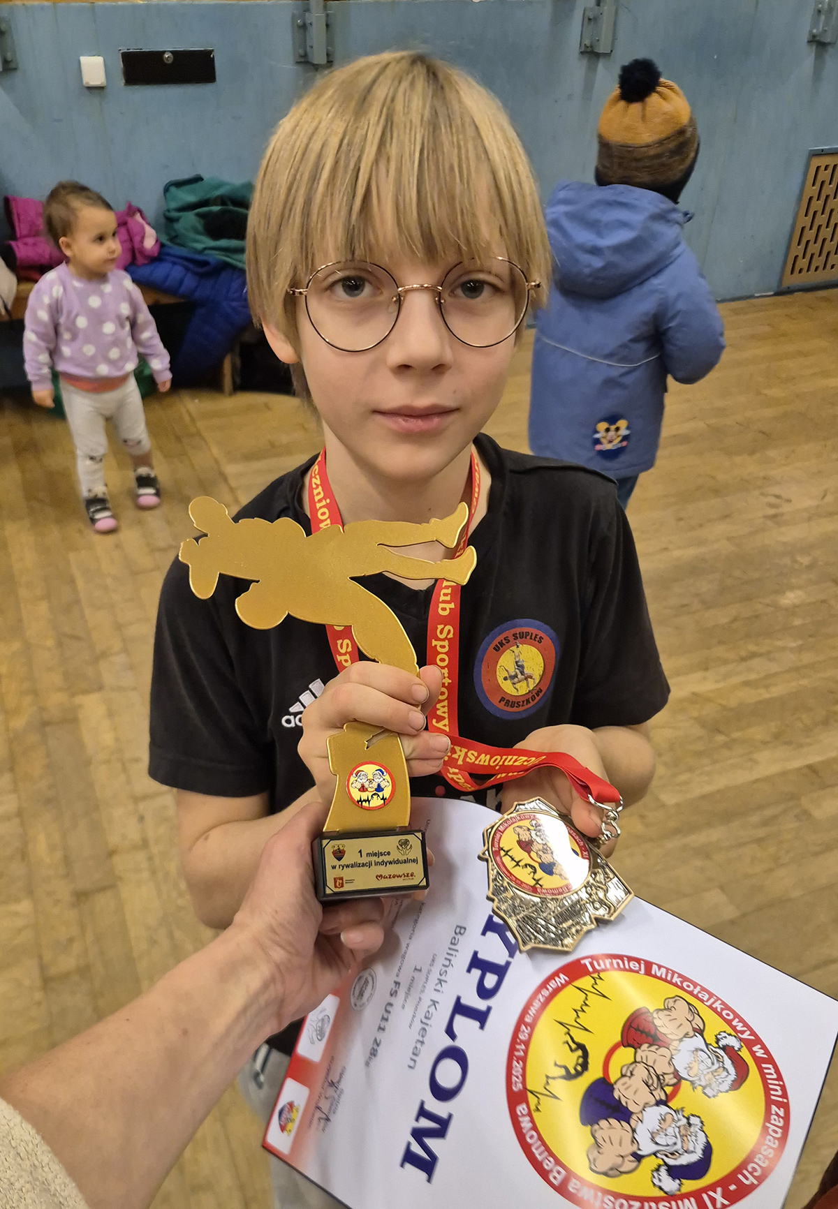 Kajtek Baliński, uczeń klasy 4B po raz kolejny zajął pierwsze miejsce w rywalizacji indywidualnej w Mikołajkowym turnieju zapaśniczym. Wszystkie walki wygrał przed czasem, nie tracąc w całych zawodach ani jednego punktu. W zawodach wzięło udział 191 dzieci z całej Polski.